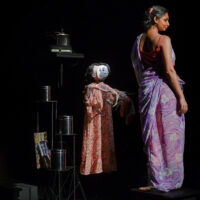 Au milieu du public, un plateau s’étire, parcouru de petites figures en chiffons colorés. De part et d’autre, une panoplie d’accessoires complète l’installation : un tabouret, un lot de boîtes cylindriques, un microphone, un harmonium, un parapluie, une poupée au visage naïf dans une robe orangée… Un décor aux reliefs de l’enfance imaginé par Mallika Taneja comme un parcours symbolique : « d’un côté se trouve l’espace sombre des rêves brisés, de l’autre, la pente glissante du bonheur… entre les deux il y a l’histoire d’une voix qui autrefois était si belle… et qu’on a maintenant oubliée. » Qui était-elle ? Où est-elle allée et surtout, pourquoi est-elle perdue ? À travers l’énigme de cette disparition, l’artiste vient déterrer les fragments d’un passé qui résonne au présent. Les objets qu’elle manipule réveillent les souvenirs comme des parties d’elle-même. Revenant avec nostalgie sur sa jeunesse et sa vie de famille, c’est la parole de sa mère, décédée alors qu’elle n’avait que 10 ans, qu’elle veut rappeler à elle. Mais l’histoire dans laquelle elle se fraye un chemin bouscule d’autres archives, d’où remontent les récits de femmes indiennes oubliées, elles aussi… En empruntant aux cultures orales, Mallika Taneja prolonge ces témoignages dans l’ambiance des instruments, en trouvant dans sa propre voix de quoi préserver leur mémoire : pour la première fois dans un spectacle, elle chante ! Par-delà les vieux mythes misogynes, voici qu’elle tend d’autres refrains et invite son audience à chanter avec elle. Dans cet espace où la voix fait un chœur, c’est la