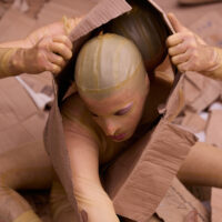 D’un paysage de détritus, amas de cartons et canettes compressés, émerge une parade amoureuse sombre et sensuelle. Dans ce jardin d’Eden inversé, des Adam et Eve au masculin se dévorent, se dissolvent et s’incorporent. Avec un lyrisme troublant, Théo Mercier compose un hymne à l’amour et à la métamorphose pour tenter de recycler au mieux les sentiments déchus.