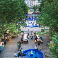 Cet usage immodéré du bleu magnifie le site patrimonial des Subsistances en offrant un écrin original pour faire dialoguer de multiples activités artistiques et la vie trépidante d’une terrasse géante. Biotope éphémère à habiter artistiquement et collectivement, BLEU met également en scène nos relations complexes et contradictoires avec les milieux aquatiques en temps de crises sociétales, économiques et écologiques.